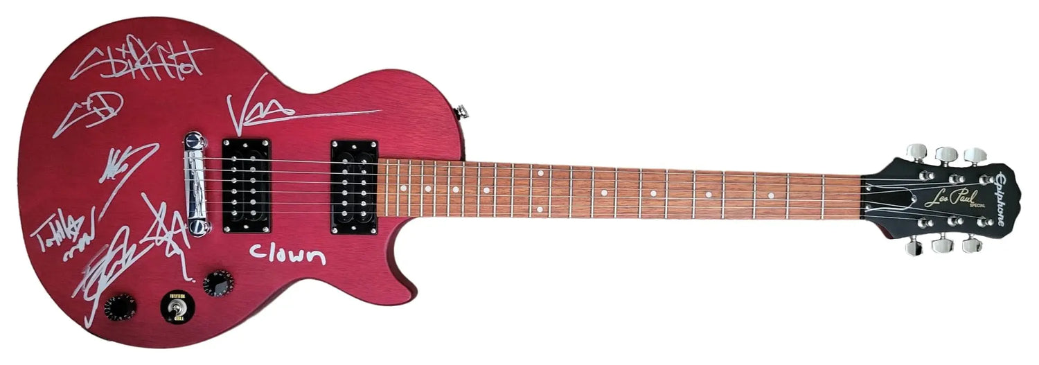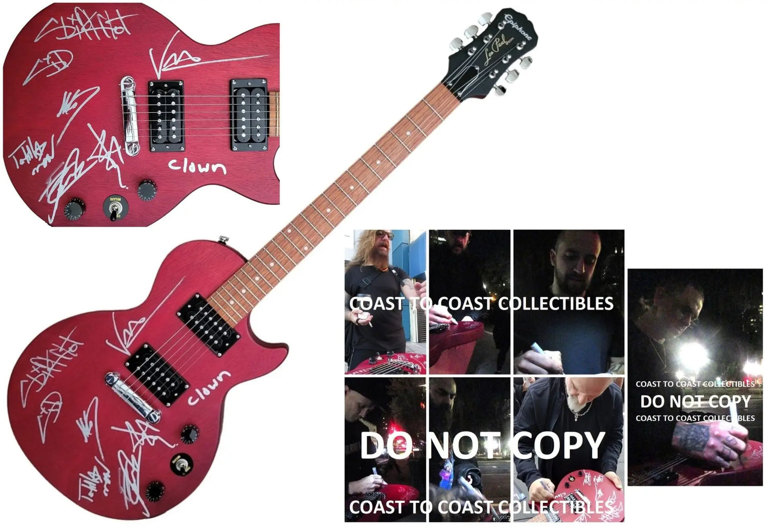 Slipknot Autographed Epiphone Les Paul special guitar. The guitar was signed by Shawn ''Clown'' Crahan, Mick Thompson, Sid Wilson, Jim Root, Alessandro Venturella, Eloy Casagrande and Michael '' Tortilla Man'' Pfaff, The guitar was signed with a silver paint pen.. Welcome to Coast to Coast Collectibles. We are proud to deliver hand collected, authentic, autographed sports/celebrity memorabilia to collectors all over the world. All of our collectibles are personally obtained by Coast to Coast Collectibles, where we strive to set the bar in providing top quality, product, and service. *Certificate of Authenticity(coa)- Each item comes with a COA from Coast to Coast Collectibles and a Tamper-proof hologram all autographs are 100% authentic and obtained by Coast to Coast Collectibles personally. *Proof Pictures- The proof photo(s) in our listings shows the athletes/celebrity signing for us and will be included with item.