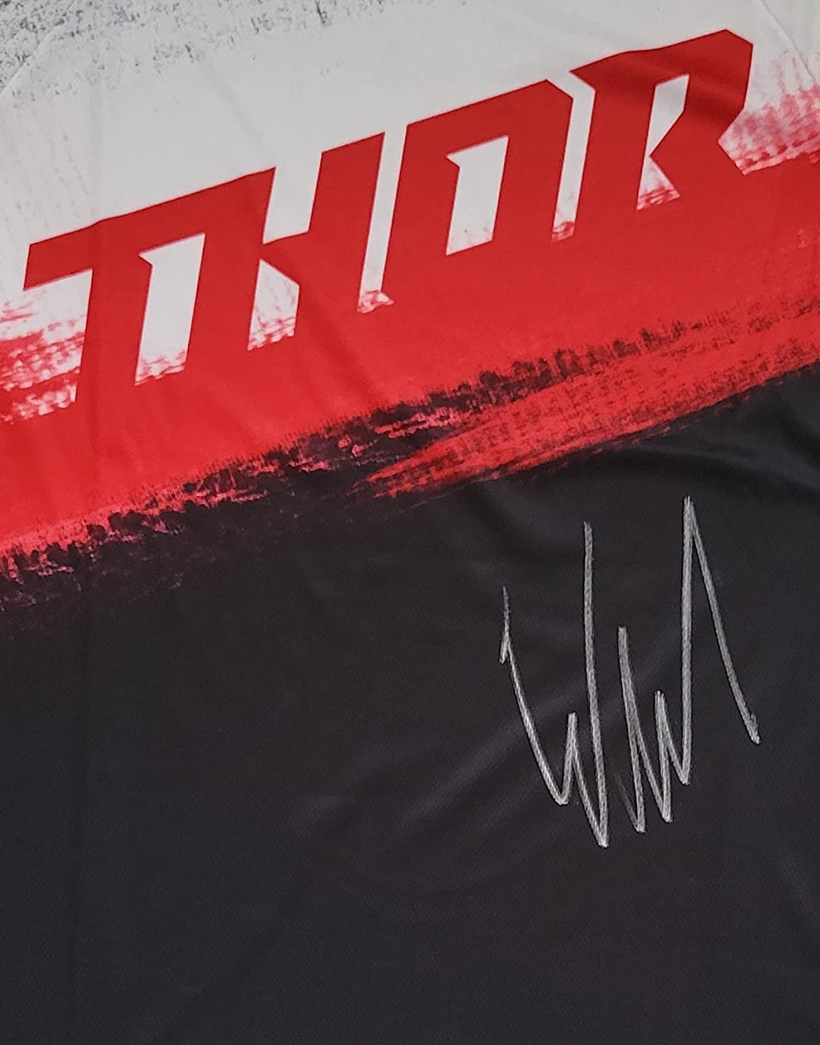 Cooper Webb signed Thor Jersey. The was signed with a silver paint pen. Welcome to Coast to Coast Collectibles We are proud to deliver hand collected, authentic, autographed sports/celebrity memorabilia to collectors all over the world. All of our collectibles are personally obtained by Coast to Coast Collectibles, where we strive to set the bar in providing top quality, product, and service. *Certificate of Authenticity(coa)- Each item comes with a COA from Coast to Coast Collectibles and a Tamper-proof hologram all autographs are 100% authentic and obtained by Coast to Coast Collectibles personally. *Proof Pictures- The proof photo(s) in our listings shows the athletes/celebrity signing for us and will be included with item.