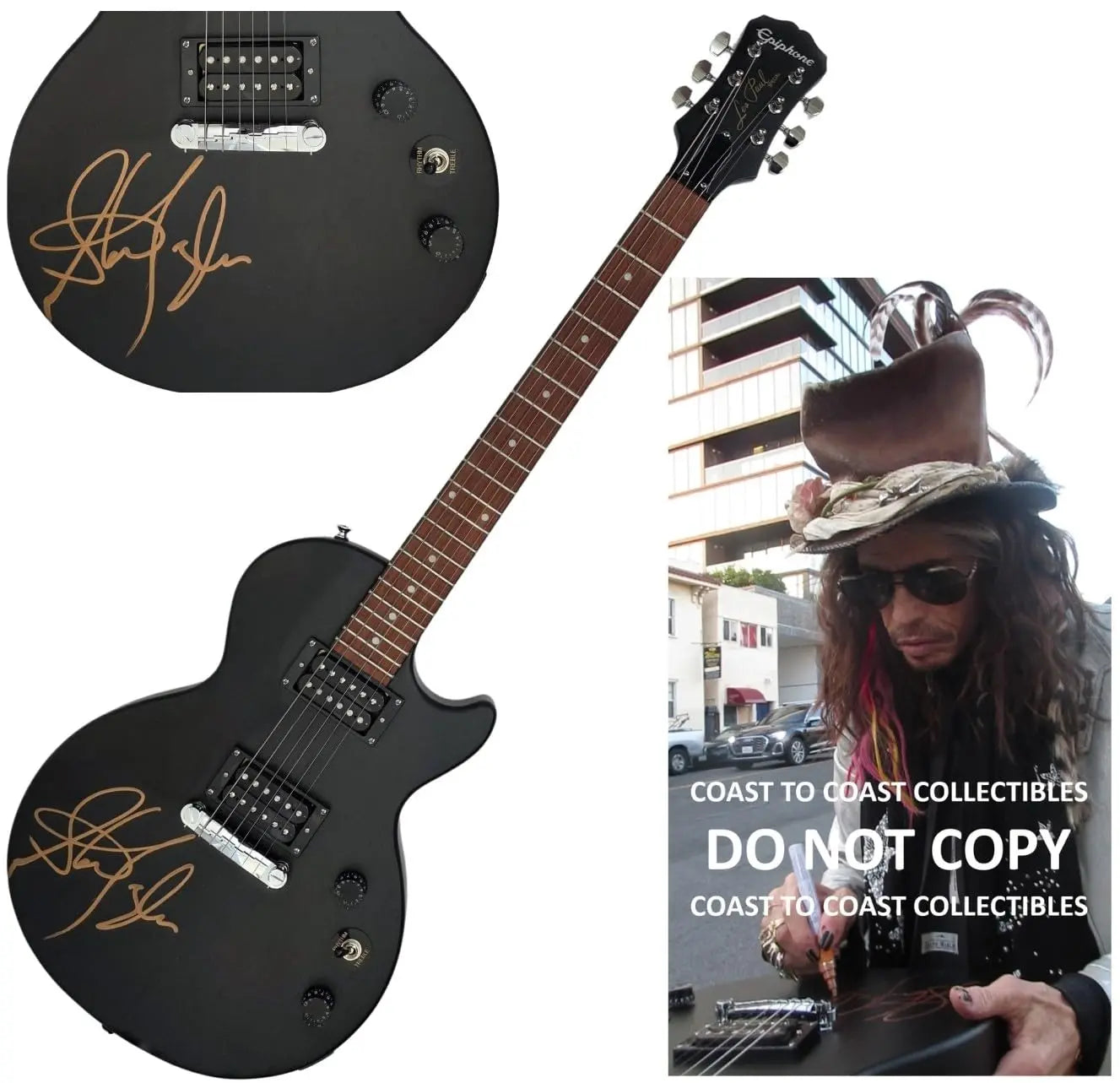 Steven Tyler Autographed Epiphone Les Paul Special Guitar, The guitar was signed with a gold paint pen.. Welcome to Coast to Coast Collectibles. We are proud to deliver hand collected, authentic, autographed sports/celebrity memorabilia to collectors all over the world. All of our collectibles are personally obtained by Coast to Coast Collectibles, where we strive to set the bar in providing top quality, product, and service. *Certificate of Authenticity(coa)- Each item comes with a COA from Coast to Coast Collectibles and a Tamper-proof hologram all autographs are 100% authentic and obtained by Coast to Coast Collectibles personally. *Proof Pictures- The proof photo(s) in our listings shows the athletes/celebrity signing for us and will be included with item.