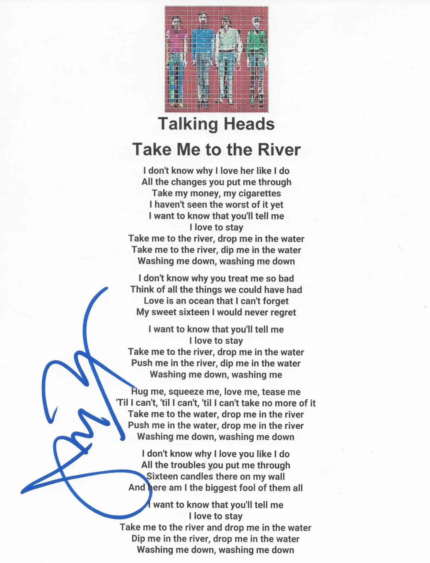 - Jerry Harrison Autographed Talking Heads Take Me To The River Lyrics Sheet
