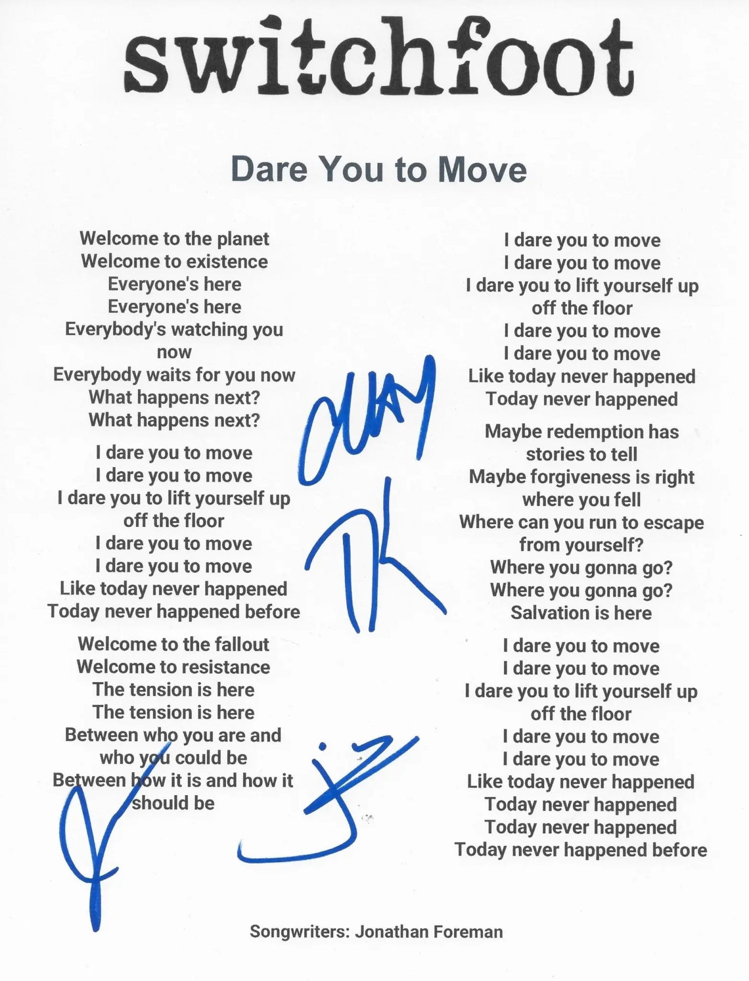 - Switchfoot Band Autographed Dare You To Move Lyrics Sheet