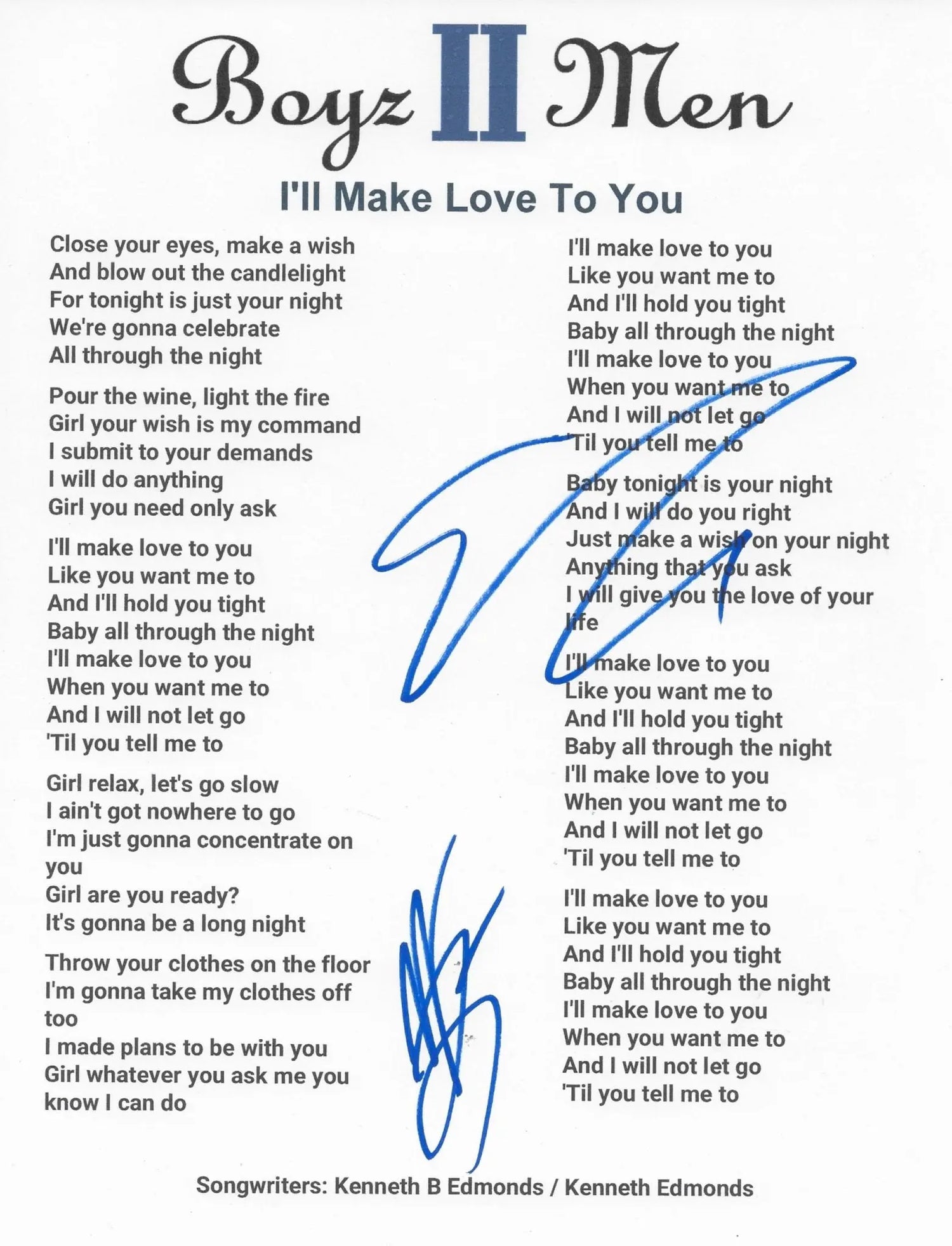 Boyz II Men Signed Ill Make Love To You Lyrics Sheet COA Exact Proof Autographed STAR