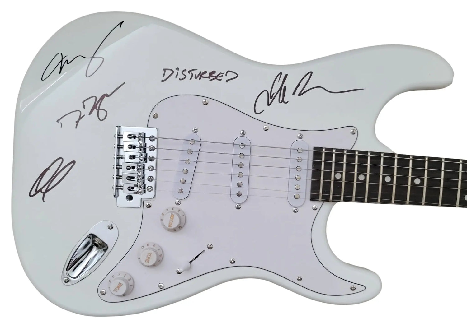 Disturbed Band Autographed Electric Guitar. David Draiman, Dan Donegan, Mike Wengren & John Moyer. The guitar was signed with a black sharpie. Welcome to Coast to Coast Collectibles We are proud to deliver hand collected, authentic, autographed sports/celebrity memorabilia to collectors all over the world. All of our collectibles are personally obtained by Coast to Coast Collectibles, where we strive to set the bar in providing top quality, product, and service. *Certificate of Authenticity(coa)- Each item comes with a COA from Coast to Coast Collectibles and a Tamper-proof hologram all autographs are 100% authentic and obtained by Coast to Coast Collectibles personally. *Proof Pictures- The proof photo(s) in our listings shows the athletes/celebrity signing for us and will be included with item.