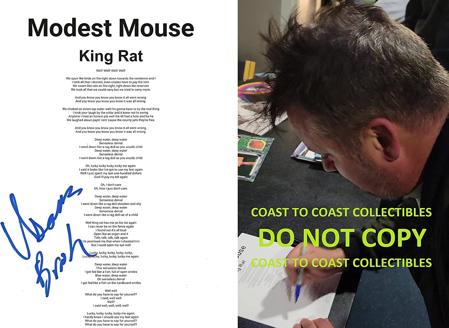Isaac Brock autographed Modest Mouse King Rat Lyrics sheet. The sheet was signed with a blue sharpie. Welcome to Coast to Coast Collectibles. We are proud to deliver hand collected, authentic, autographed sports/celebrity memorabilia to collectors all over the world. All of our collectibles are personally obtained by Coast to Coast Collectibles, where we strive to set the bar in providing top quality, product, and service. *Certificate of Authenticity(coa)- Each item comes with a COA from Coast to Coast Collectibles and a Tamper-proof hologram all autographs are 100% authentic and obtained by Coast to Coast Collectibles personally. *Proof Pictures- The proof photo(s) in our listings shows the athletes/celebrity signing for us and will be included with item.